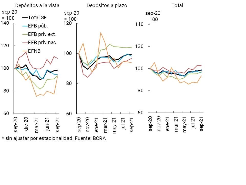 Considerando las partidas en moneda extranjera, en el mes el saldo de depósitos en dicha denominación se redujo 0,2% —en moneda de origen—. Los depósitos totales del sector privado (en moneda nacional y extranjera) disminuyeron 0,3% real con respecto a agosto (+3,1% nominal).