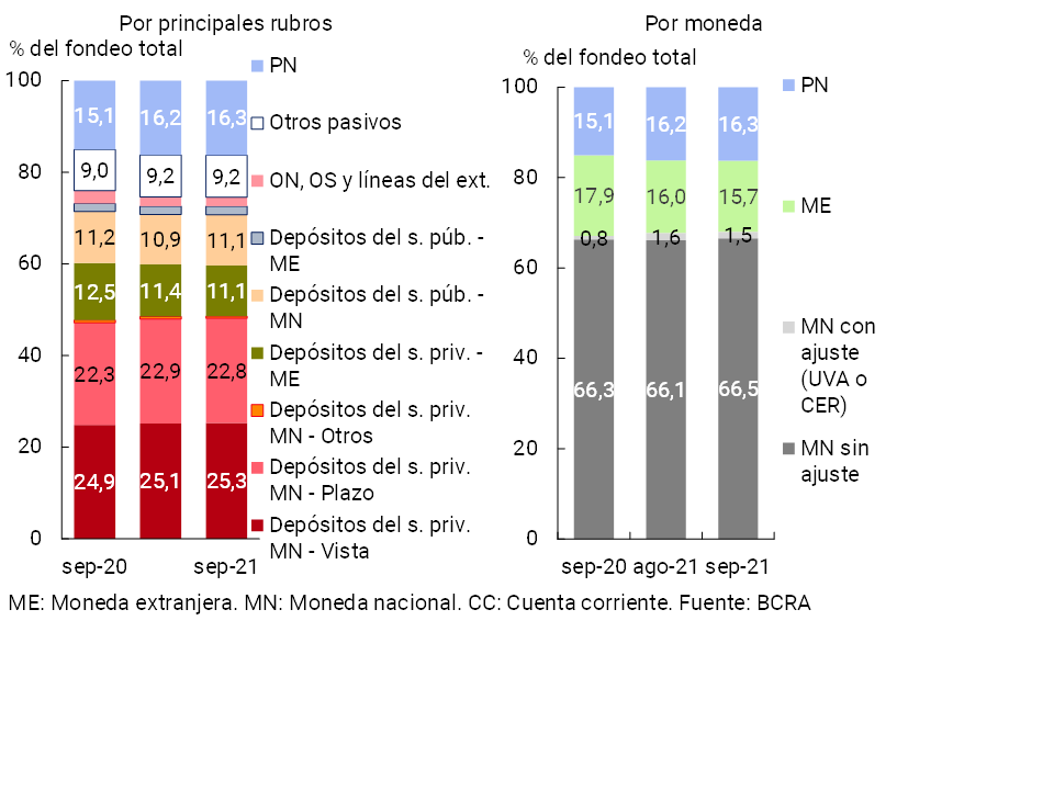 Con relación a la composición del fondeo del sistema financiero, en el mes aumentó levemente la ponderación de los depósitos del sector público en moneda nacional y se redujo la de los depósitos del sector privado en moneda extranjera (ver Gráfico 6). La participación del resto de las partidas que integran el fondeo no mostró cambios significativos con respecto a agosto. Por su parte, las partidas en pesos sin cláusula de ajuste aumentaron su relevancia en el total, mientras que aquellas denominadas en moneda extranjera y aquellas con ajuste por CER o UVA redujeron su peso relativo.