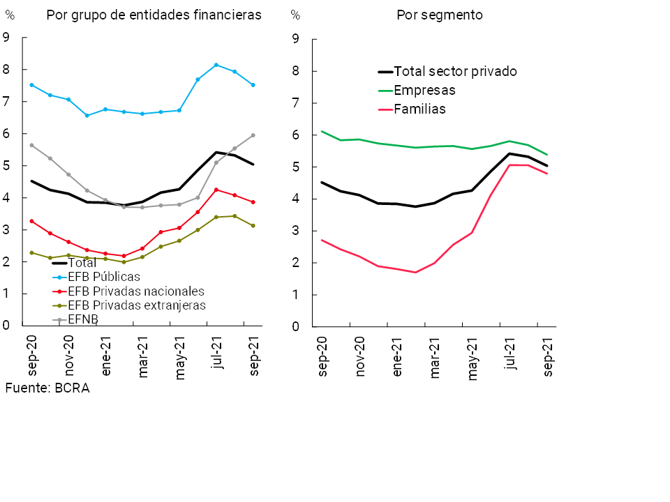 En septiembre la irregularidad de las financiaciones a las familias se ubicó en 4,8% del total de crédito a este segmento (ver Gráfico 10), 0,3 p.p. por debajo del nivel del mes anterior (+2,1 p.p. i.a.). El desempeño mensual estuvo principalmente conducido por la caída en la mora de los créditos instrumentados vía tarjetas de crédito. Por su parte, el indicador de morosidad del crédito destinado a las empresas se situó en 5,4% en el periodo, también 0,3 p.p. por debajo del valor de agosto (-0,8 p.p. i.a.). La reducción mensual se verificó en todas las asistencias crediticias a excepción de las prefinanciaciones a la exportación.