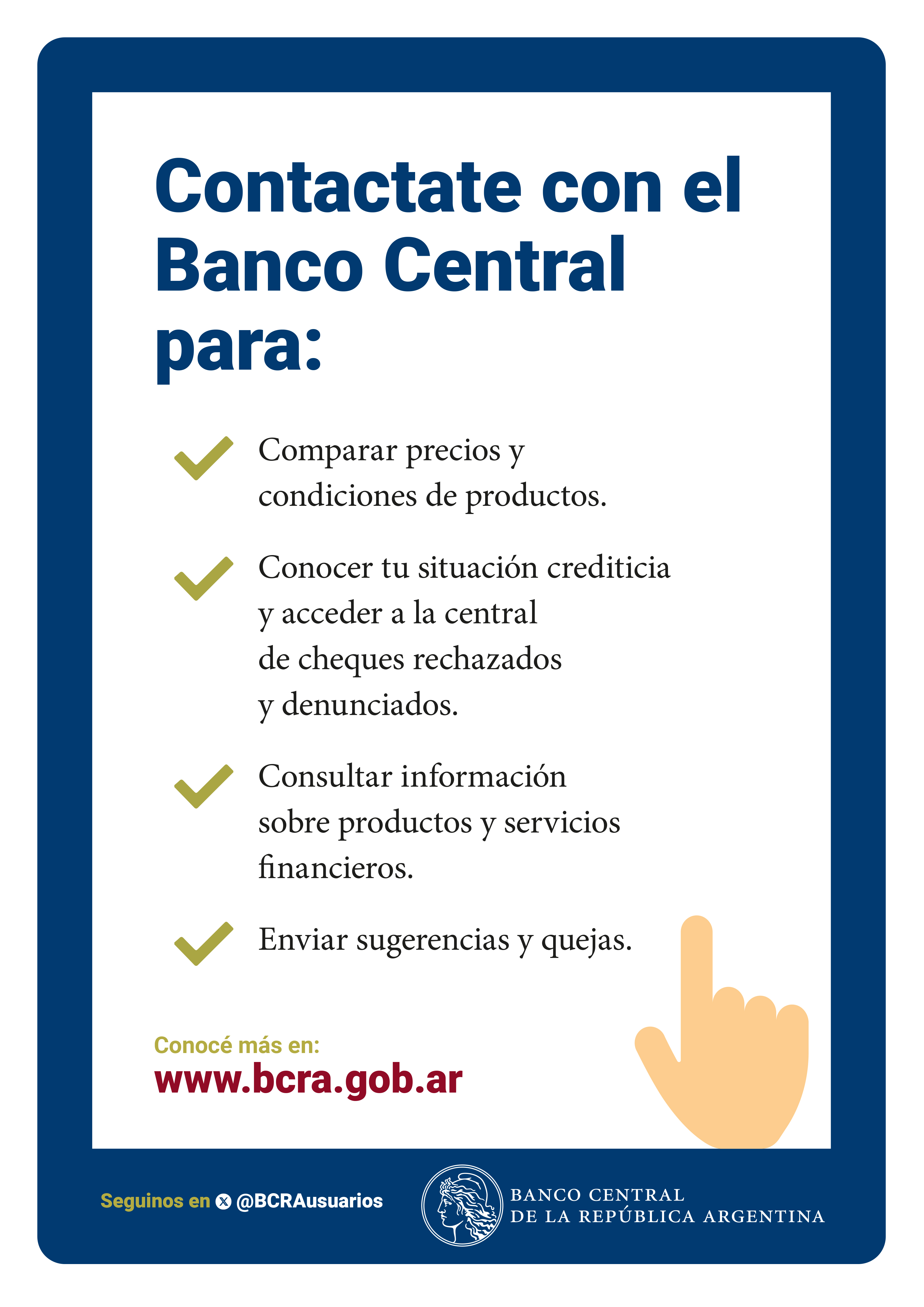 Además, los bancos deberán ofrecerte un enlace en sus sitios web a nuestro sitio web, para que cuentes con la información para realizar tus consultas, sugerencias, quejas y reclamos de manera inmediata.